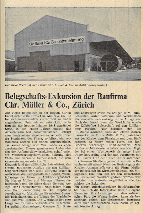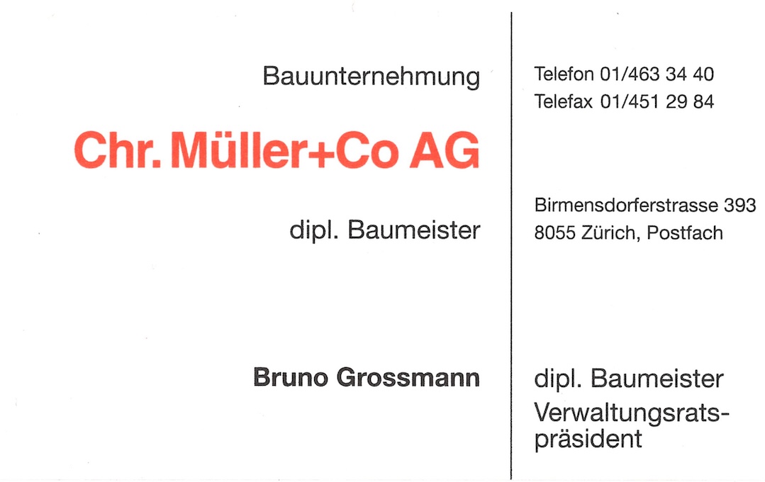 1998: Während eines halben Jahrhunderts wurden fast alle Bauten erstellt, die Menschen im Laufe ihres Lebens brauchen: von der Frauenklinik und dem Kinderspital in Zürich über Kindergärten, Schulen, Kliniken, Wohn- und Geschäftshäuser, Tankstellen, Einkaufszentren und Zivilschutzanlagen bis hin zu Kirchen und Friedhofsbauten. Im Tiefbau von Fernheizkanälen über Bauarbeiten für die Wasser-, Gas- und Elektrizitätsversorgung, die Abwasserentsorgung und die Telekommunikation bis zu Bauwerken für Verkehrsbetriebe.