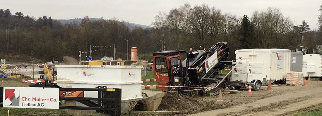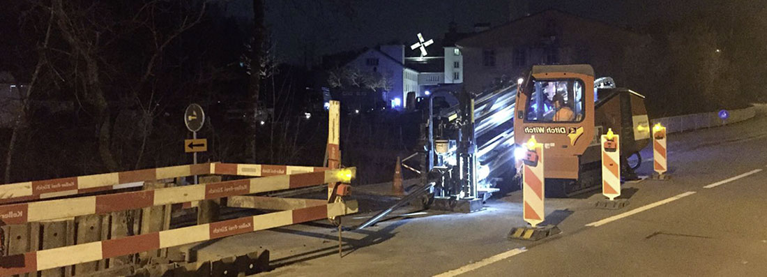 Es wurden 32 m Stahlrohre DN 813 mm mit dem Pressbohrsystem PBA 155 vorgepresst, eingebaut und verschweisst sowie der Hohlraum verfüllt. Startschacht und Gräben, inkl. Werkleitungsbau, Kanalbau, Schachtsysteme, Belagsbau